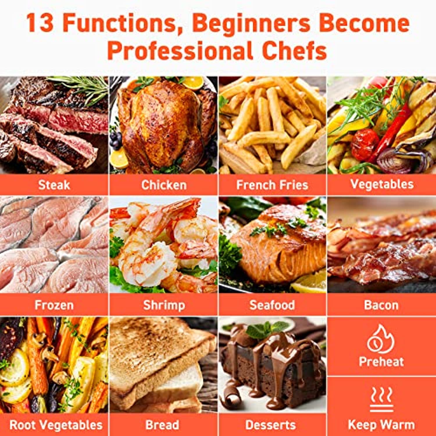 - 100 INCLUDED RECIPES: Find inspiration for every meal with 100 original, COSORI-chef-created recipes that include size, cook time, and temperature. Even beginner chefs can cook with confidence.
