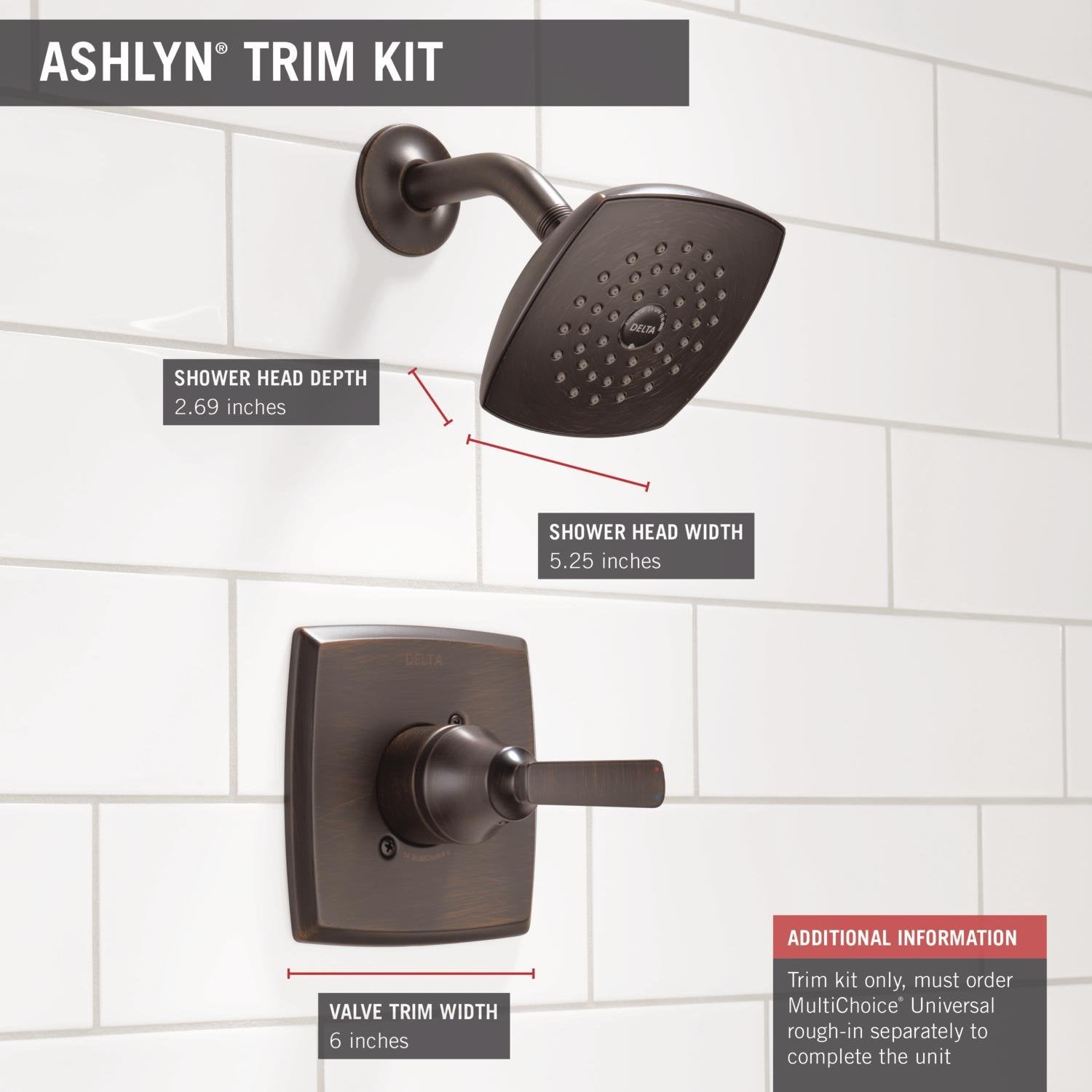 With sleek, angular lines and soft edges, the Ashlyn bath collection creates a modern appeal at an attractive price. While other products may gather unsightly mineral build-up over time, Delta soft rubber Touch-Clean spray holes allow any mineral residue on your Delta shower head to simply be wiped away for an instantly refreshed look – with no need for soaking or the aid of chemical cleaners. An ornate blend of deep, warm tones and subtle highlights give Venetian Bronze a hand-brushed look that can transform a bathroom. Offering a smooth contrast to light tones and coordinating well with darker ones, this finish can have a beautiful soothing effect on almost any space. Delta pressure-balance shower valves use Monitor Technology to protect you and your family from sudden water temperature changes due to flushing toilets or running appliances. Delta WaterSense labeled sink faucets, shower faucets and toilets use at least 20% less water than the industry standard—saving you money without compromising performance. This unit does not include the required Delta MultiChoice Universal Valve and must be purchased separately (recommended rough-in model R10000-UNBXHF). You can install with confidence, knowing that Delta shower faucets are backed by our Lifetime Limited Warranty.