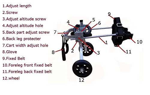 It has roller blade wheels with bearings, padded shoulder support, double thronged neoprene adjustable shoulder harness, and built in double rear adjustable padded leg stirrups. Both male and female dogs can still go to the bathroom comfortably in this rear harness.
