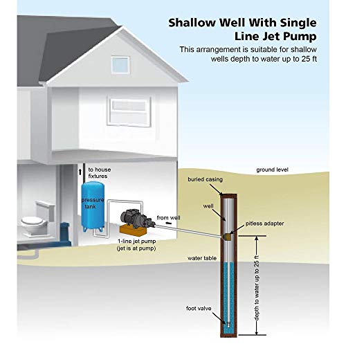 The Everbilt 3/4 HP shallow-well jet pump has a pre-wired pressure switch 30/50 psi for automatic operation and self-primes after the housing is initially filled with water. The fiberglass-reinforced thermoplastic pump housing resists corrosion. This pump comes ready to install and is designed for wells with pumping levels of 25 foot or less. This jet pump has a fan-cooled and dual voltage 115/230-Volt motor. Details -Adjustable Speed: No -Inlet Connection: Threaded female -Amperage (amps): 8 -Jet Pump Product Type: Shallow Well -Cord Length (foot): 0 -Maximum Pressure (psi): 65 -Corrosion Resistant: Yes -Maximum Working Temperature (F): 77 -Discharge Flow 0 foot @ 40 PSI (gallons/hour): 552 -Minimum working temperature (F): 35 -Discharge Flow 15 foot @ 40 PSI (gallons/hour): 444 -Non-Clogging: No -Discharge Flow 25 foot @ 40 PSI (gallons/hour): 360 -Number of Impellers: 1 -Discharge Flow 40 foot @ 40 PSI (gallons/hour): 0 -Outlet Connection: Threaded female -Discharge Flow 5 foot @ 40 PSI (gallons/hour): 0 -Power Type Required: AC -Discharge Flow 60 foot @ 40 PSI (gallons/hour): 0 -Product Weight (pound): 16.79 pounds -Discharge Flow 90 foot @ 40 PSI (gallons/hour): 0 -Pump Switch Type: Switchless -Float Switch: No -Hardware Included: No -Self-Priming: Yes -Head Pressure (foot): 148 -Thermal Overload Protection: Yes -Horsepower (hp): 0.75 hp -Voltage (volts): 115/230 -Housing Material: Thermoplastic -With Tank: No