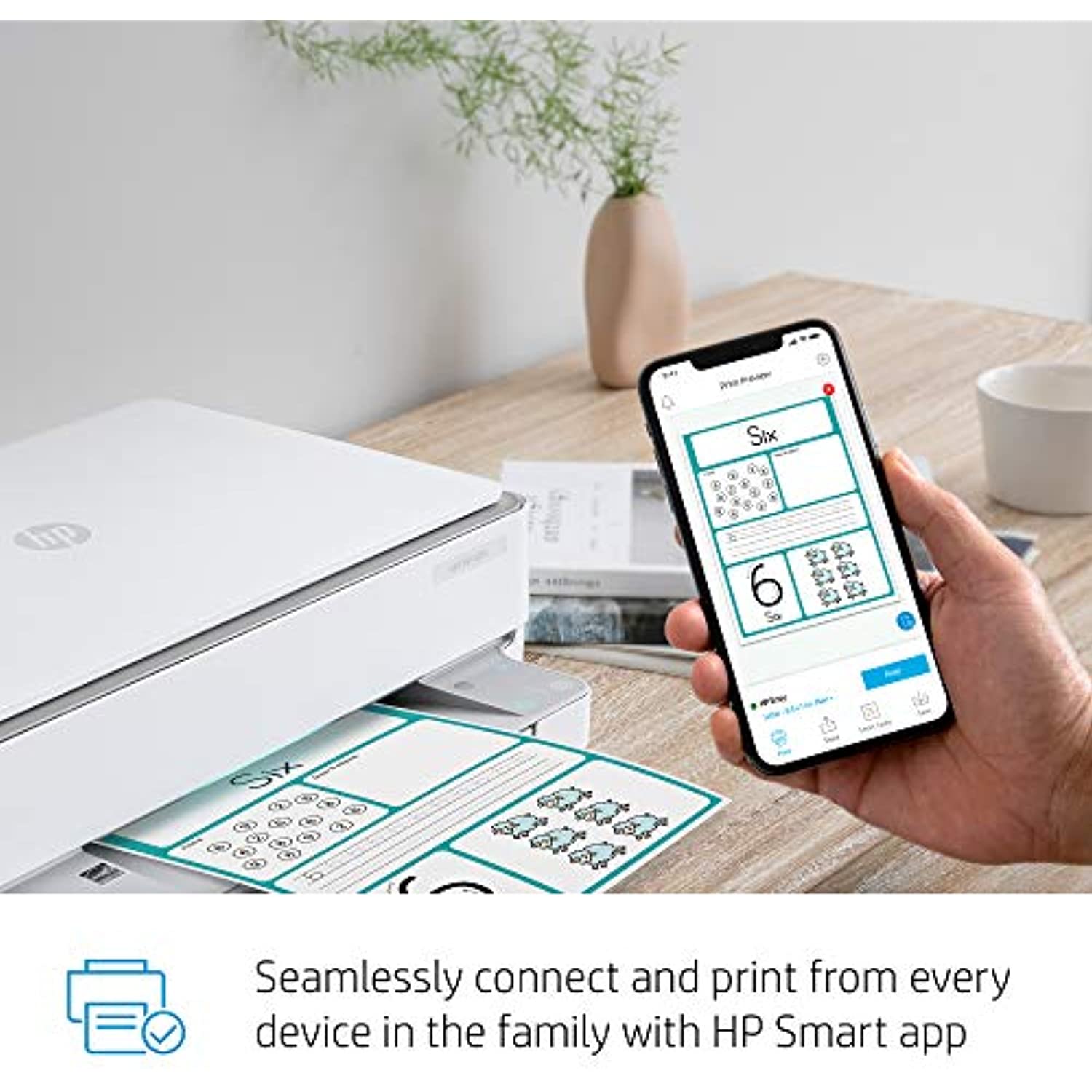Designed to make printing easier for the whole family, the HP ENVY 6055 all-in-1 Printer lets everyone print, scan, and copy everyday documents, schoolwork, borderless photos, and more. This wireless picture printer can order ink for you and deliver it to your door with up to 50% savings on ink using the HP Instant Ink delivery service, so you can print high-quality documents and photos when you need them (subscription required). Set up and connect the all-in-one printer to your family's mobile devices in a few easy steps for remote scanning and sharing using the HP Smart app. And, keep connected and reduce interruptions with self-healing Wi-Fi.