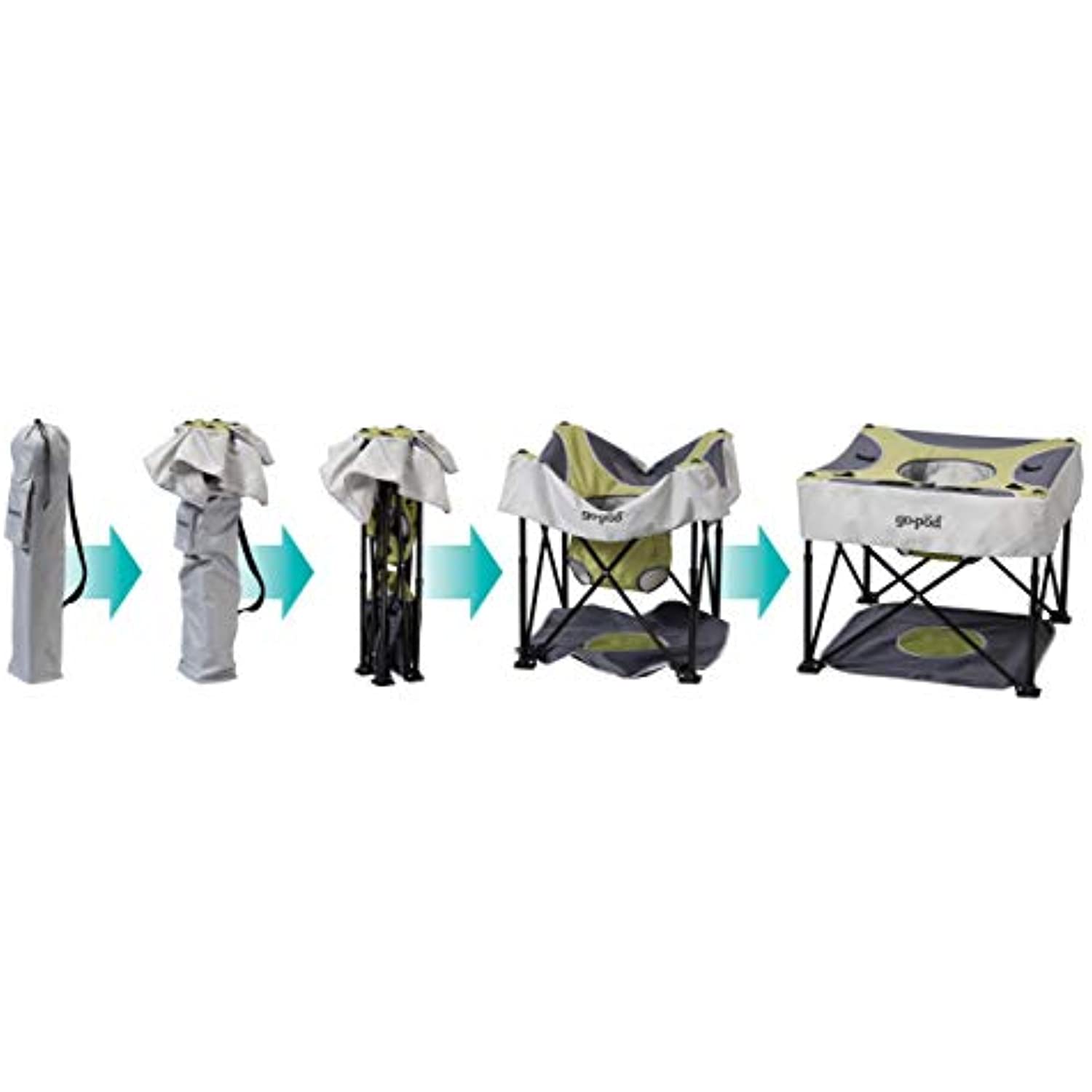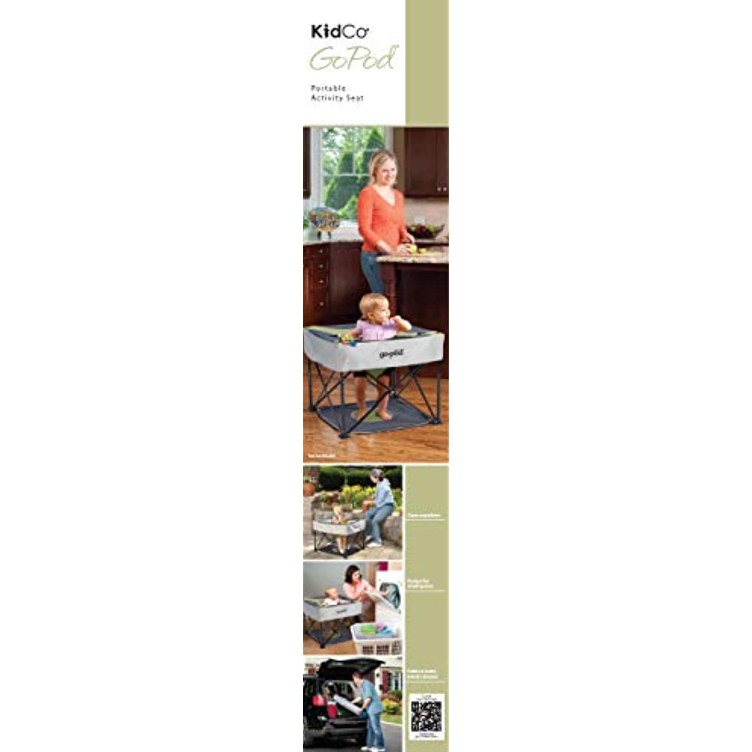 Fold and go design makes the Go-Pod the perfect choice for use both indoors and outdoors. Easily unfolds and can be moved from room to room. The KidCo GoPod is a lightweight and portable Activity Center to keep your child safe and entertained at home or "on-the-go". Simply fold up, put it in a handy carrying bag with storage and take it with you anywhere you go. The KidCo GoPod Portable Baby Activity Station features a floor pad to keep little one’s feet from touching undesirable surfaces and a locking button to ensure the safety of your baby. It is a great item to have for your growing baby thanks to the four seat height positions. It is easy to adjust so it can grow with your child. Five nylon toy loops located in different places at the top of the GoPod hold your baby's favorite toys in place and within reach. It also sports a drink and snack holder so your child will have everything they need to stay safe and entertained while you relax a little bit. Folded dimensions: 6.5"L x 6.5"W x 29.5"H. Open dimensions: 24"L x 24"W x 19.5"H (at lowest seat level) . 100% Polyester fabric