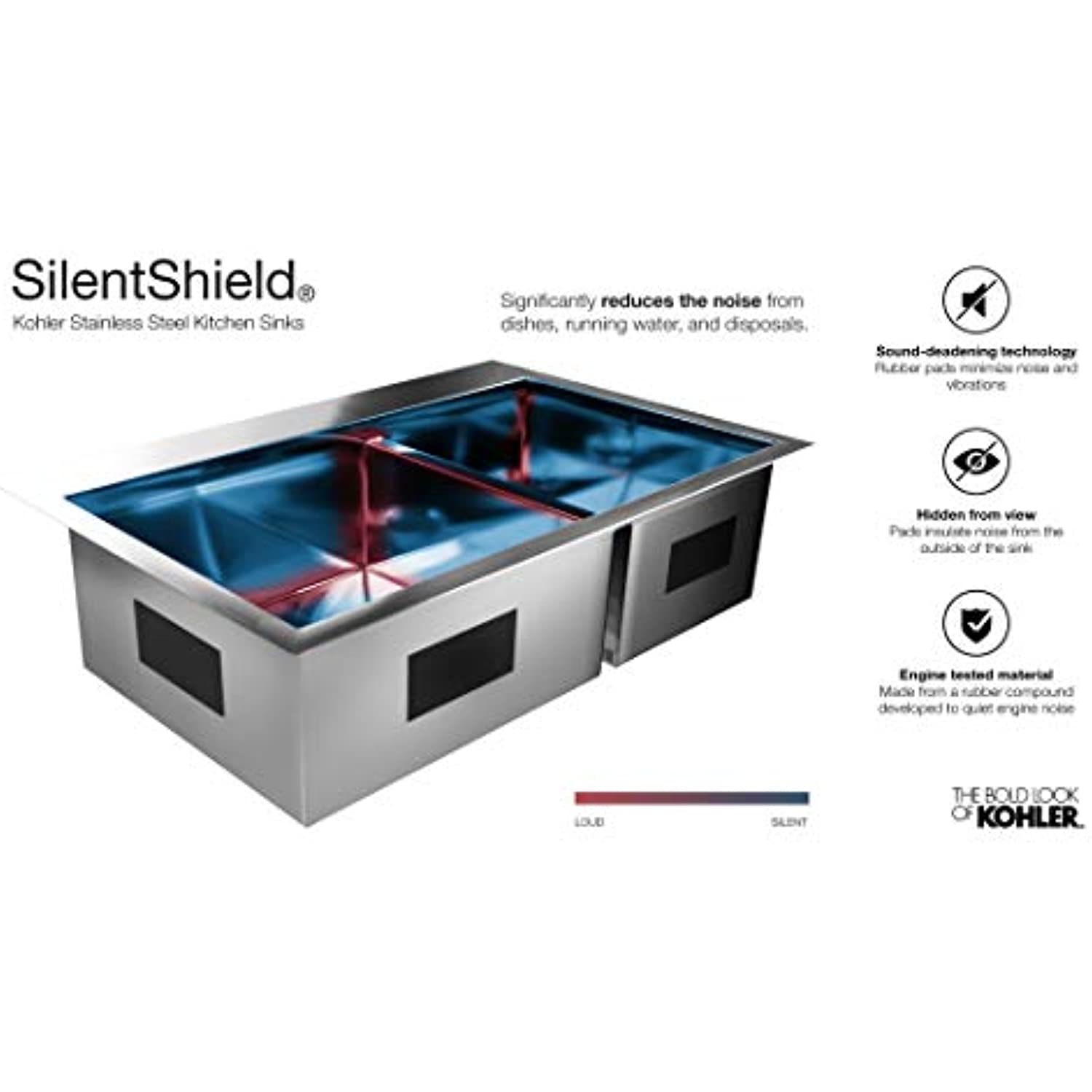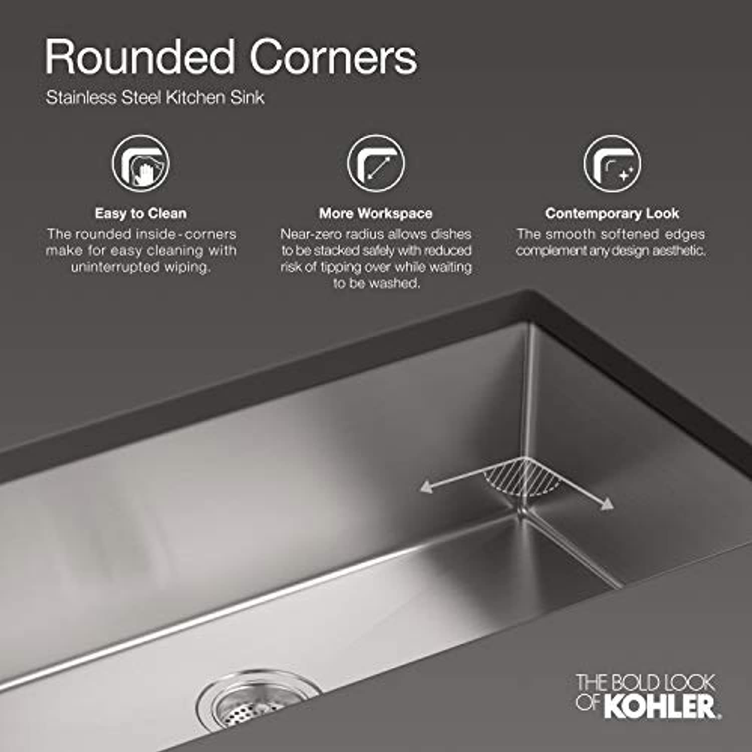 This Strive kitchen sink offers professional style with easy-to-clean curved corners. made of thick, premium quality 16-gauge stainless steel, the apron-front sink has a Self-Trimming design that requires only a simple rough cut, overlapping the cabinet face for beautiful results. The under-mount sink is designed to fit in most standard 36 in. apron-front cabinetry. The single large bowl features a sound-absorption system that significantly reduces disposal and dishwashing noise.