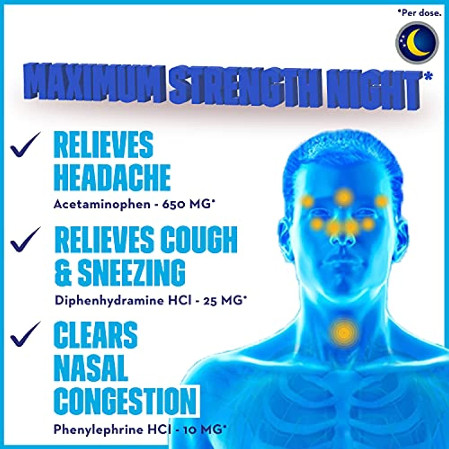 - Night helps to alleviate nasal congestion, sinus pressure, pain, running nose, sneezing and control cough so you're able to get to sleep