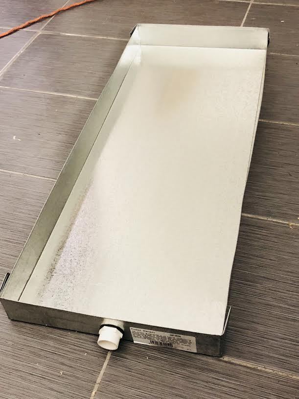 Drain pans collect condensation to prevent leakage in walls and ceilings due to moisture run-off from primary AC pans. Galvanized steel construction with attached PVC fitting. Locate under HVAC unit and attach to 3/4 in. drain line (not included).