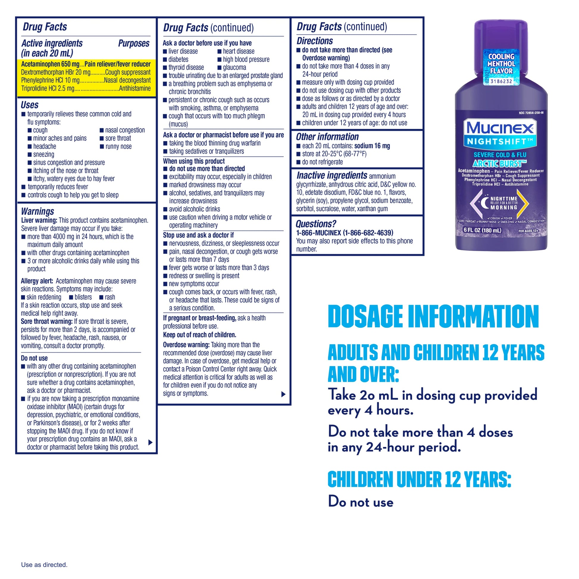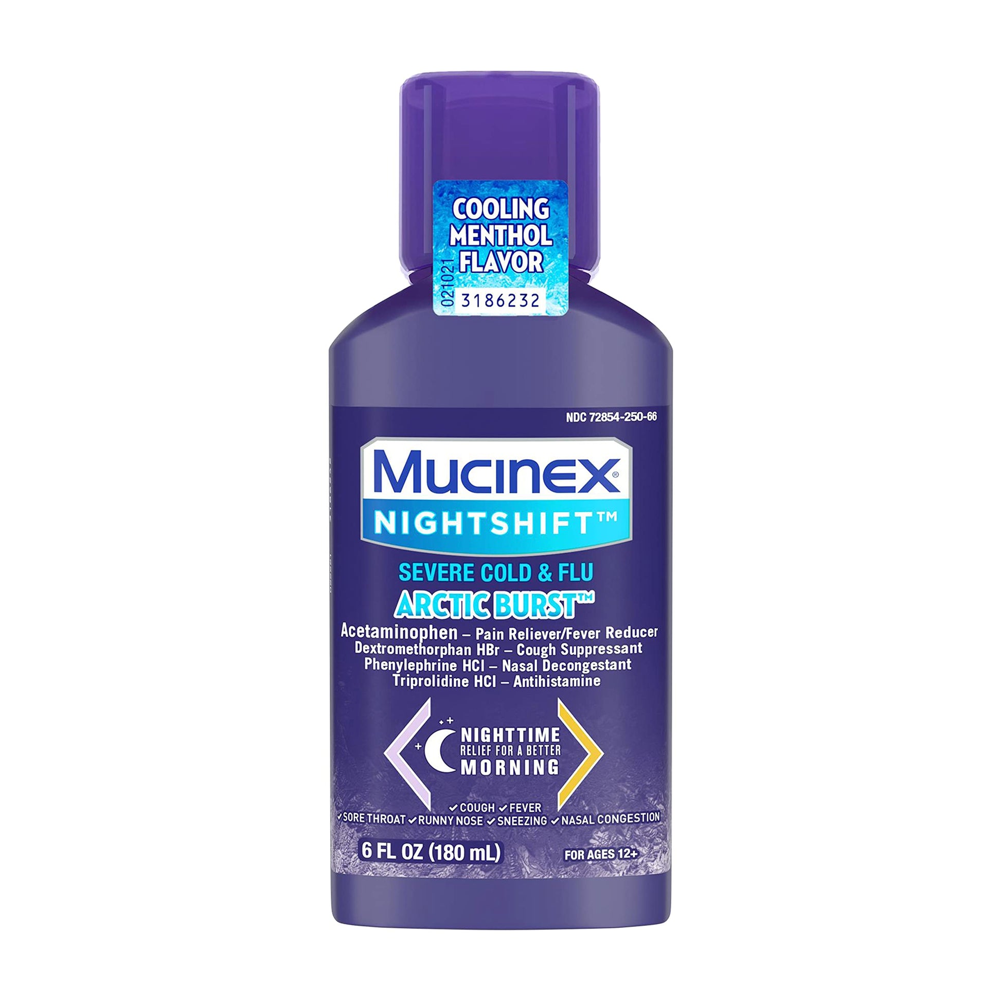 Mucinex Nightshift Cold & Flu Clear & Cool is a Night time Multi-Symptom Relief medicine for your Cold & Flu Symptoms with an instant burst of cooling Menthol flavor. Mucinex Nightshift Cold & Flu Clear & Cool helps reduce fever, relieve pain, headache, cough, runny nose, sneezing and sore throat, nasal congestion. Mucinex is the #1 most trusted brand among doctors for cold and cough symptoms for themselves and their families*