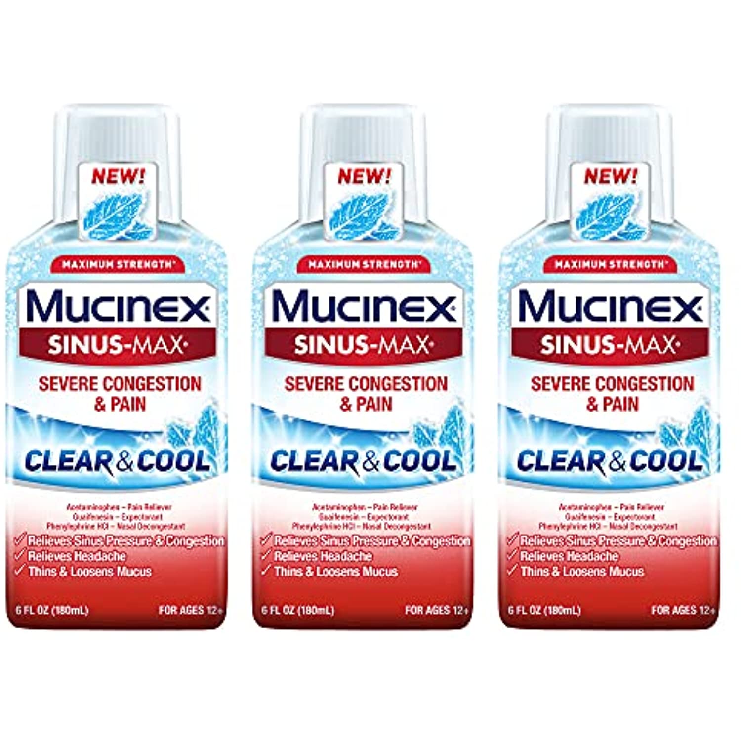 Relieve severe congestion and headaches for up to 12 hours with MUCINEX SINUS-MAX Clear & Cool Adult Liquid - Severe Congestion Relief 6 oz . This maximum strength formula will coat your throat with a menthol burst, that you'll feel all the way into your nasal passages. This formula combines 3 maximum strength medicines in each dose and is designed to get rid of headaches and mucus and clear your sinuses.