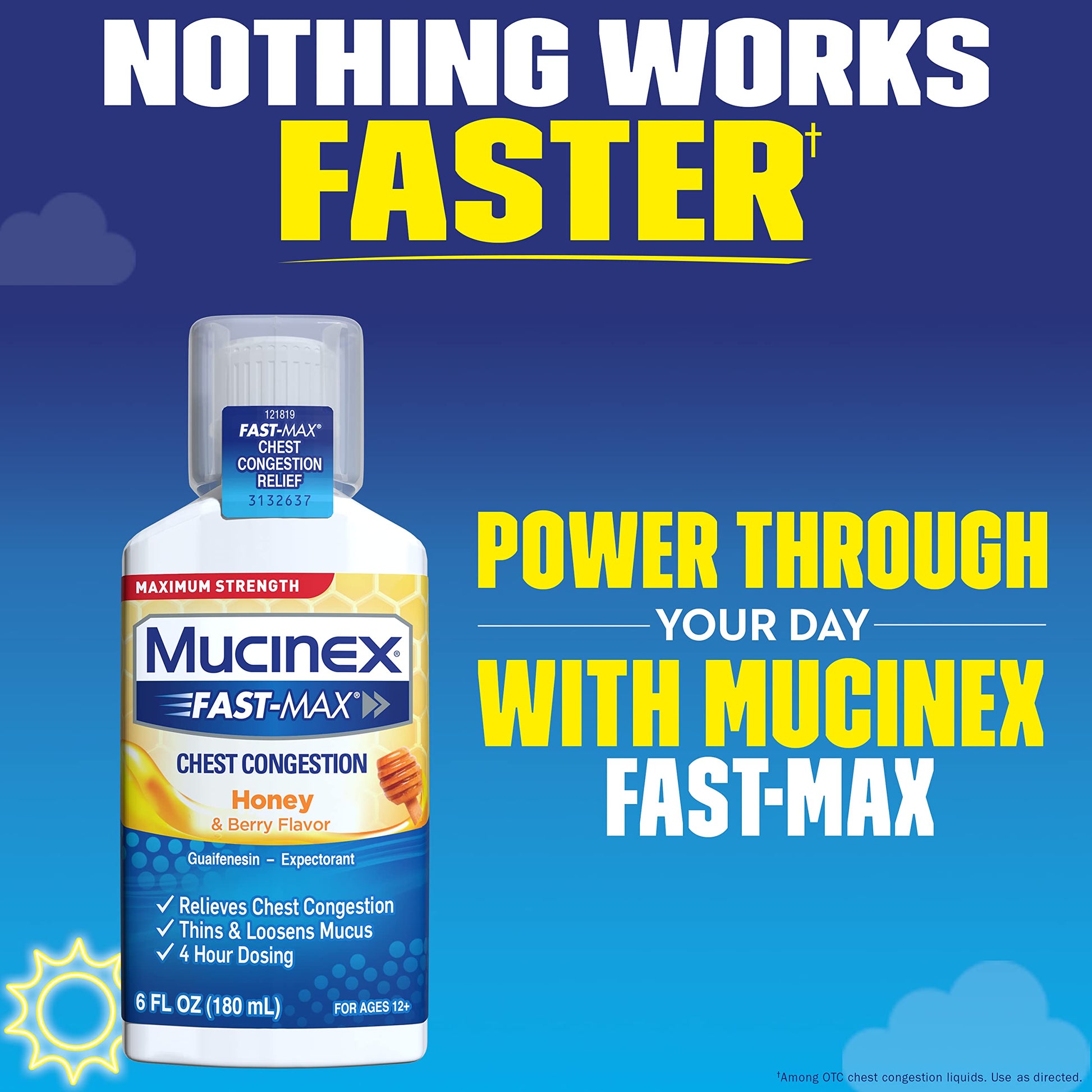 - MAXIMUM STRENGTH RELIEF: Maximum Strength Mucinex Fast-Max Chest Congestion Honey & Berry Flavor helps thins and loosens mucus and relieves chest congestion