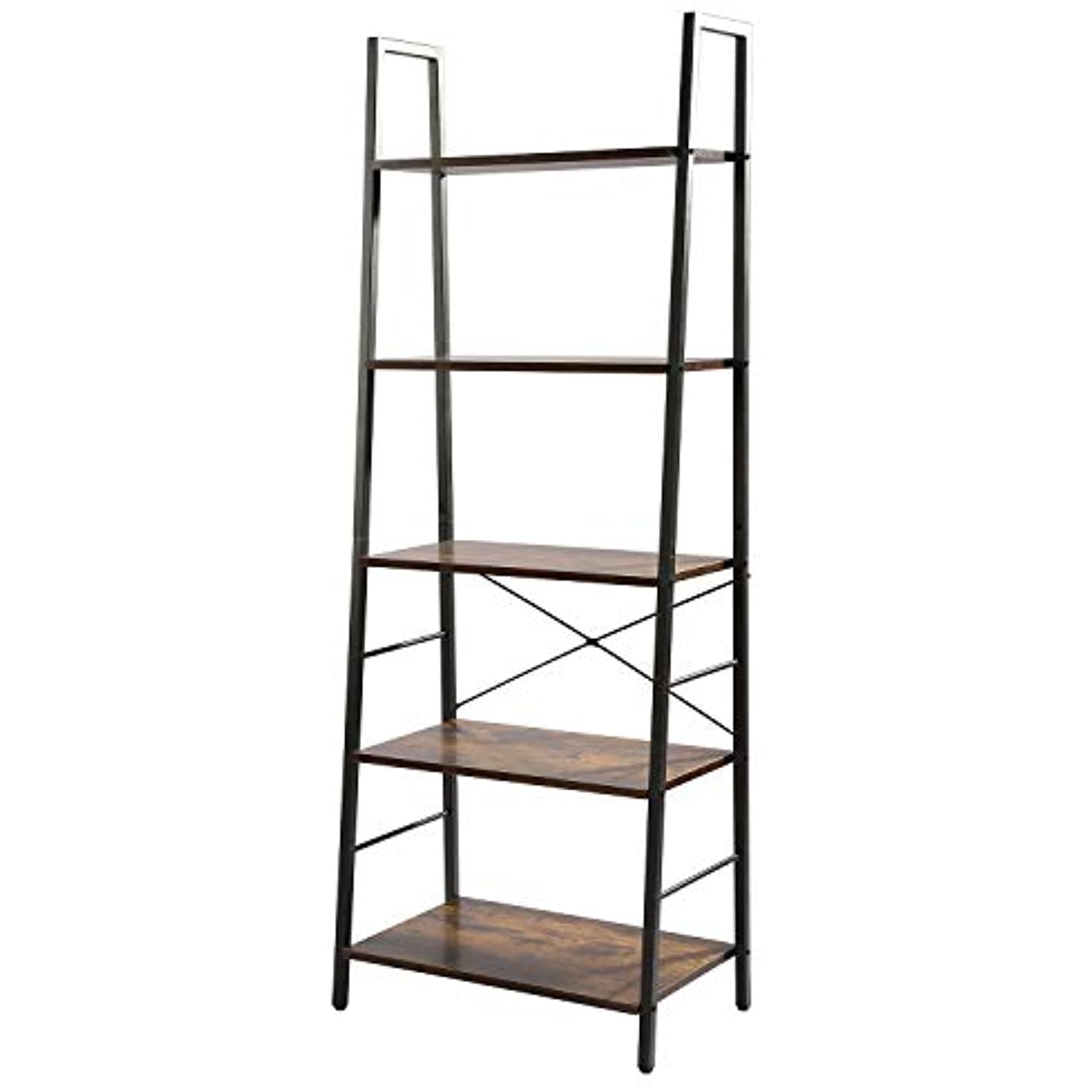 With an attractive appearance and functional design, this ladder shelf is suitable for any room and is always in full play.With four different shelves to store all your living room, bedroom, or office essentials, this ladder bookcase is the perfect way to maximize and enhance your space.  Dimensions: 23.6"Wx14.2"Dx63"H - Material: Engineered Wood+Metal - Assembly: Required - Net weight: 23.1lb - Gross weight: 26.36 lb Shipping List: - 1 x 5 tier Bookshelf - 1 x