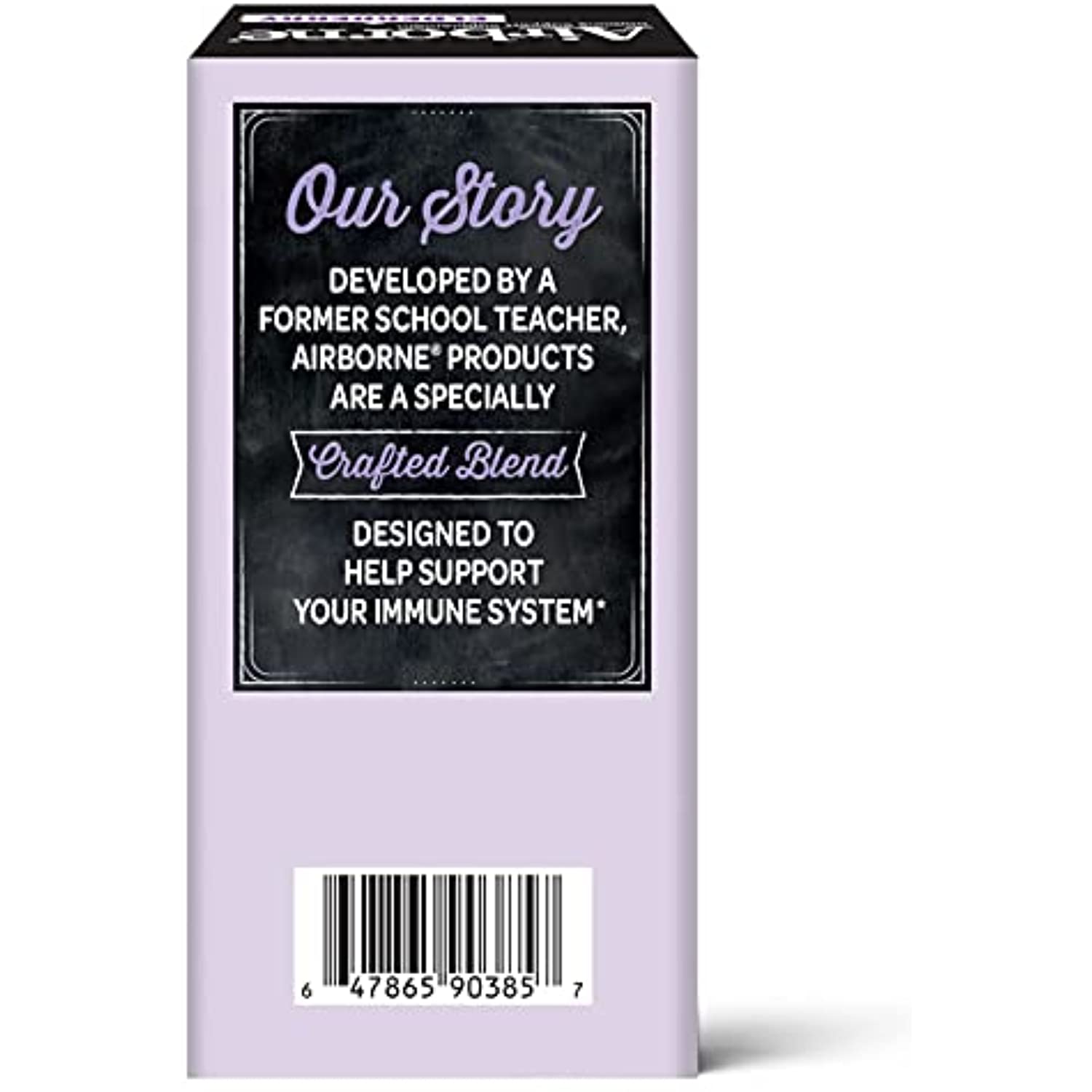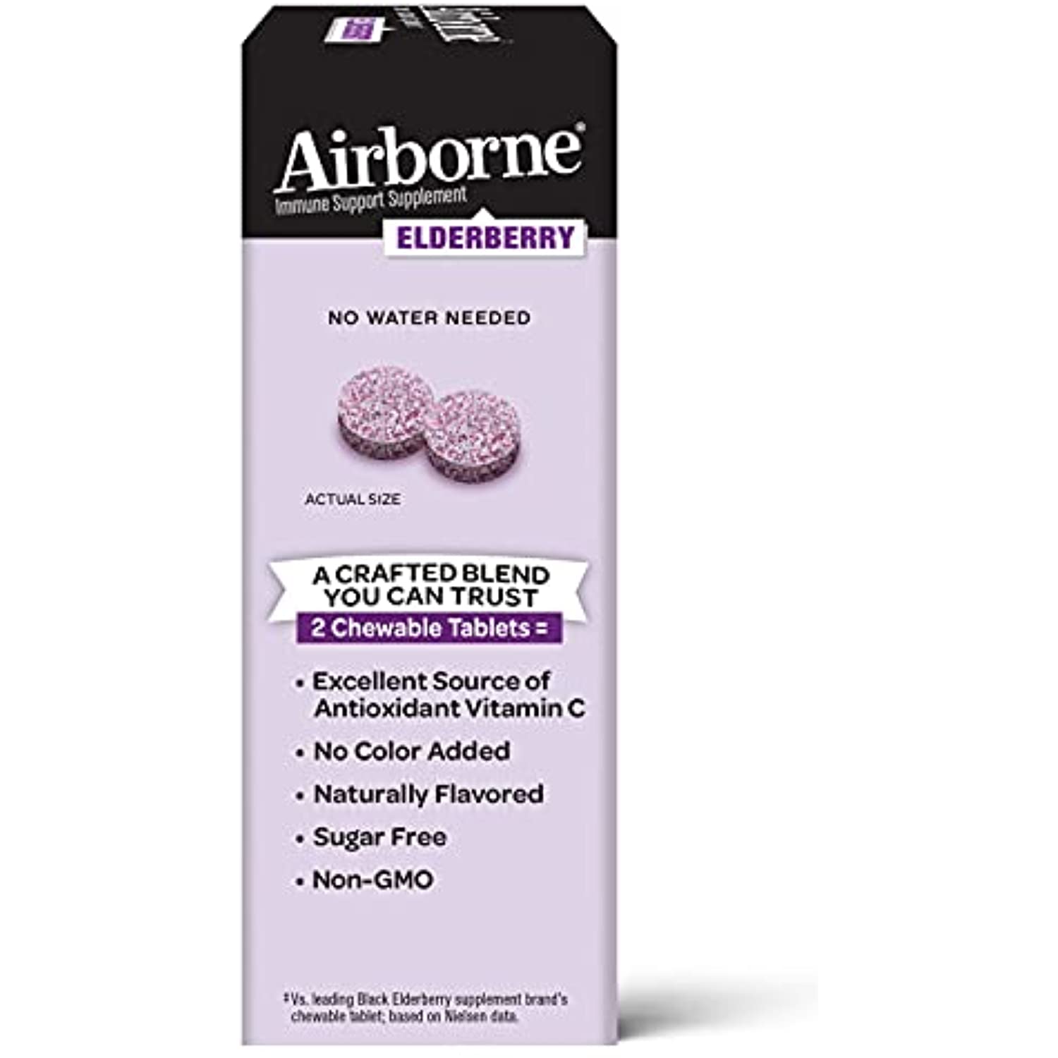 Airborne Elderberry Chewable Tablets provide immune support in a great-tasting and an easy-to-take form; no water needed. Each serving (2 tablets) delivers a blast of 200mg of Vitamin C + 100mg of Elderberry Extract. Developed by a former school teacher, Airborne products are specially designed to help support your immune system.* Airborne is the #1 Immune Support Gummy, Effervescent and Chewable Brand‡ *These statements have not been evaluated by the Food and Drug Administration. This product is not intended to diagnose, treat, cure or prevent any disease.