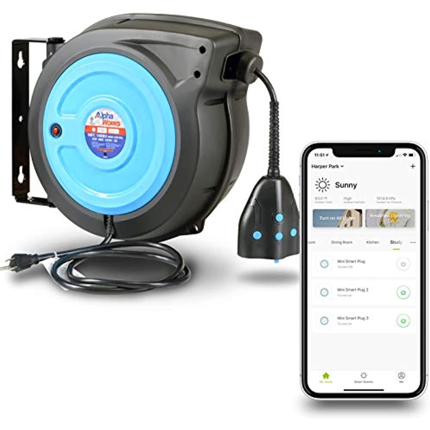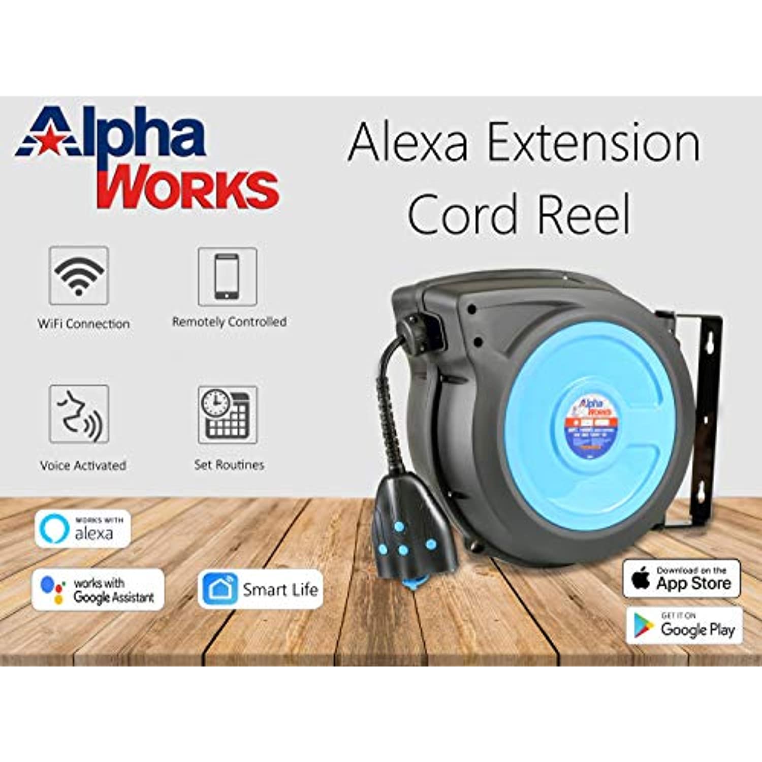 This AlphaWorks Extension Cord Reel Smart Plug Alexa is the WORLDS 1ST & ONLY SMART EXTENSION CORD REEL. This Commercial capable Extension Cord Reel Smart Plug is designed for all DIY or Professional applications. This Smart Reel is truly unique & the 1st ever for the market of cord reels. Built with Advanced Tech & Easy Voice Command design. Compatible with: WORKS WITH ALEXA, Google Home/Assistant, Smart Life App, IFTTT & WiFi/Voice Control, providing dependable performance. This Reel has an ASTOUNDING AC 100V-240V 13A 1625W 50/60Hz power rating of electricity, supplying power for 2 AC Outlets/Smart Sockets independently or together, can be set w/ independent functioning timers by voice command (Wi-Fi Requirement: 2. 4Ghz Only, No Hub Required) or control them by switch buttons (Each button has an indicator for recognition). Built w/ Advance Slow Retraction Technology (SRT) tech providing smooth consistent speed of orderly retraction at all times. The 2 AC Outlets have a two Button Cap design, protecting the equipment overall from dust/debris. Made of IP64 Weather Resistant casing (IP44 for EU) for outstanding resilience to water/weather & ABS fireproof material, with both surge/overload/over current & overheat protection. The countdown timer(s) can automate various functions within the intelligence home or wherever desired, to make applications Smart Tech Operated. The Extension Cord is Premium Grade SJTOW Cable material. This Reel is OSHA, FCC, ETL, UL, RoHS, ISO: 9001, 14001, CNAS, SQC, IAF, approved, certified & cull quality tested. The smart outlets can connect coffee makers, lamps, fans, sprinklers + MORE for your smart home voice control & automation needs (Note: Smart Life App minimum requirements - Android 4/IOS 8 or above). The Smart Socket built-in timer function makes it easy to schedule starting & ending times, with a WiFi range up to 320 feet line of sight, in the harshest temperatures of: 14°F to 140°F (-10°C to 60°C).