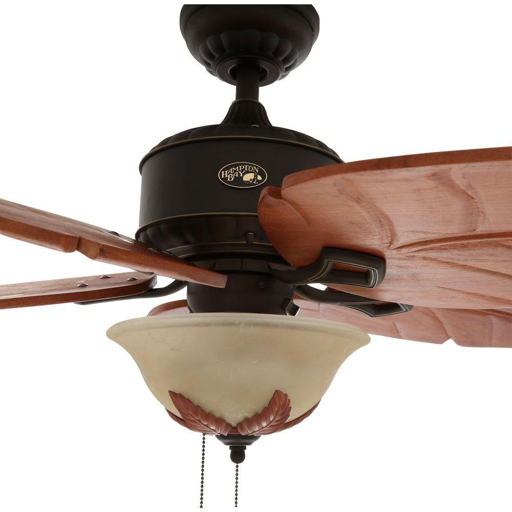 This beautiful Hampton Bay Antigua Oil Rubbed Bronze Ceiling Fan adds a graceful touch of style with its hand-carved medium cherry finish feather wood blades. The hand-painted alabaster light contributes to the fan's sculptural quality and complements the Oil Rubbed Bronze finish. The Antigua can complement many interior decors as either a focal or accent piece. Uses two 9.5-Watt LED bulbs (included).