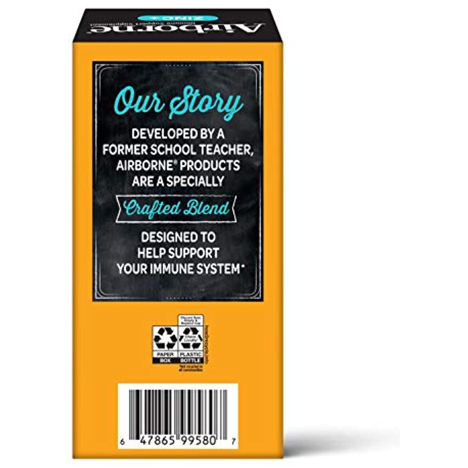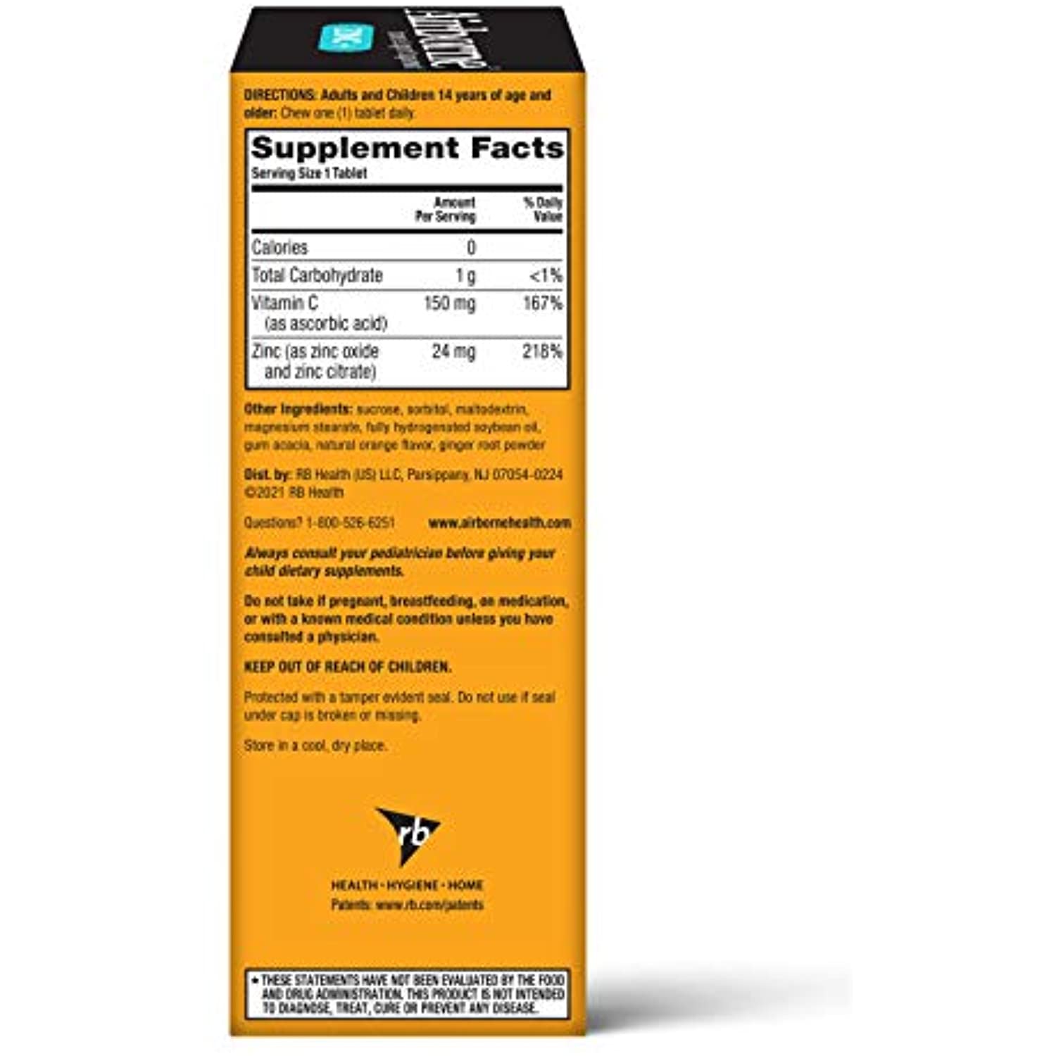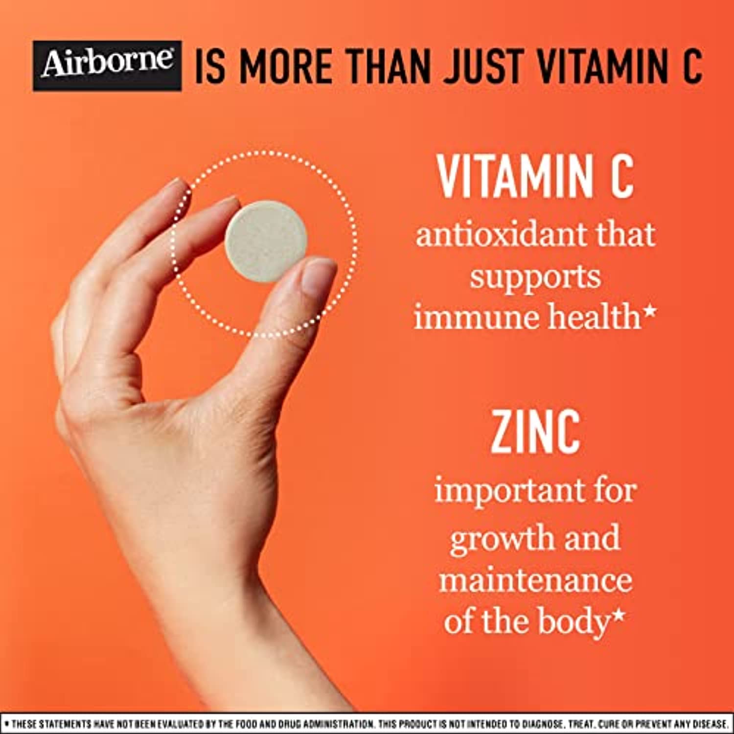 Airborne comes Zinc + Vitamin C Orange Flavor Chewable Tablets are a unique Vitamin & Mineral crafted blend that helps support your immune system.* This once daily Gluten-Free and Non-GMO supplement is an excellent source of ZINC and is high in the antioxidant Vitamin C. WHY TO TAKE ZINC + VITAMIN C: Airborne is the #1 Immune Support Gummy, Effervescent & Chewable Brand.¹ Airborne ZINC + Vitamin C chewable tablets easy & convenient for you or your family to take on the go or at home. Vitamin C is among the most important vitamins and antioxidants in immune health.* DEVELOPED BY A FORMER SCHOOL TEACHER: The original Airborne recipe was cooked up by an ingenious teacher about 20 years ago. Why? Because throughout the school year, she wanted to provide her immune system with proper support. *These Statements have not been evaluated by the Food and Drug Administration. This product is not intended to diagnose, treat, cure or prevent any disease. ¹Based on unit sales L52W through 4/3/2021