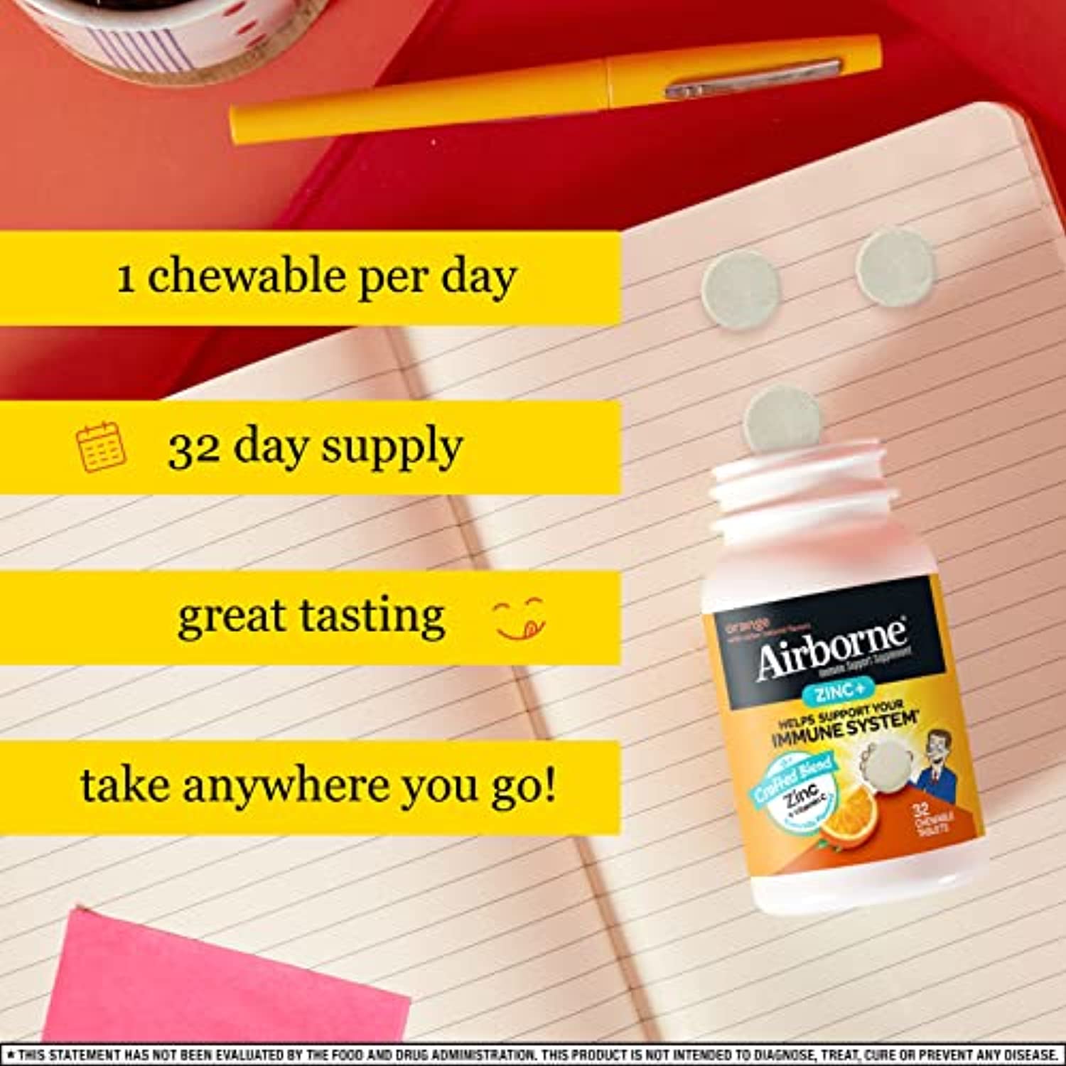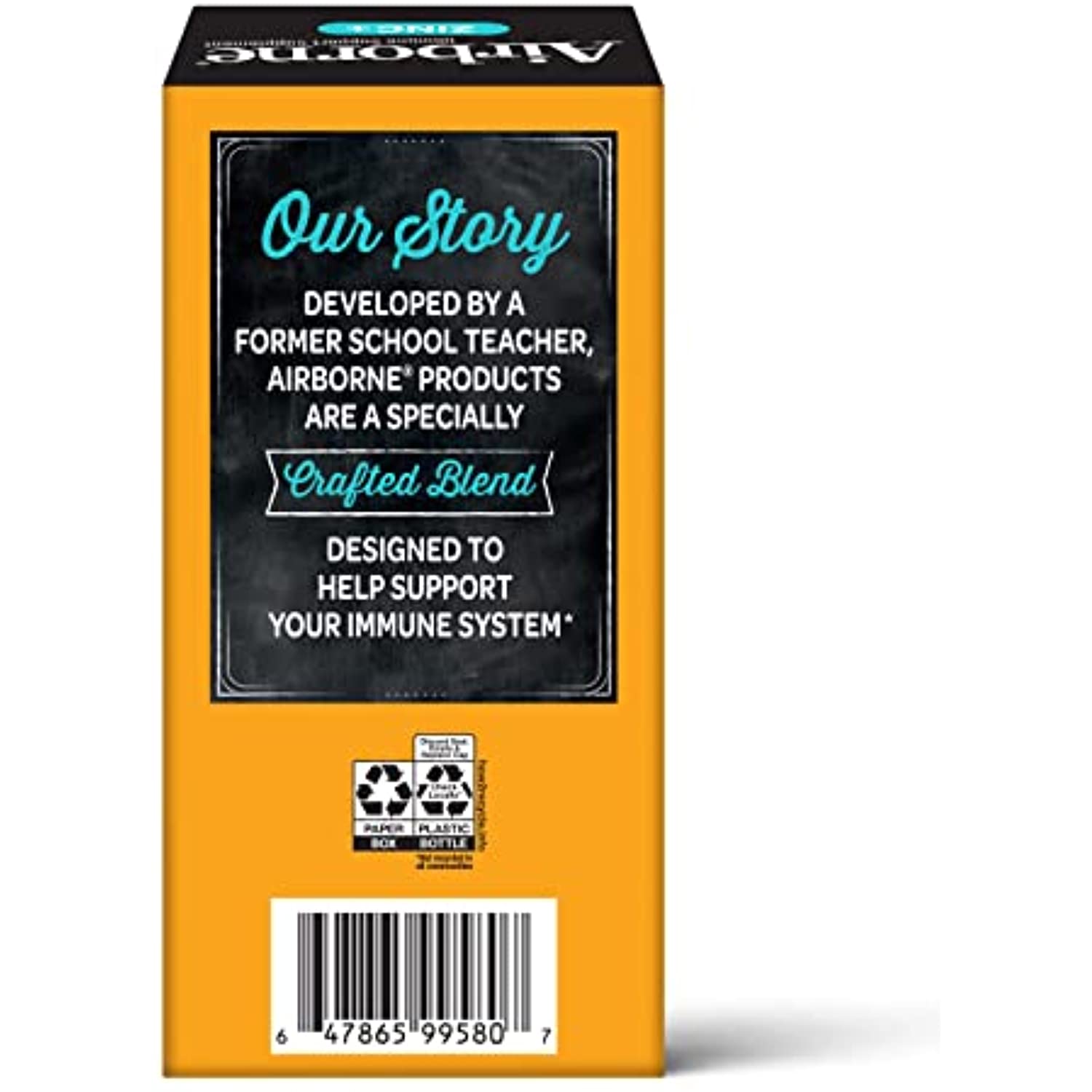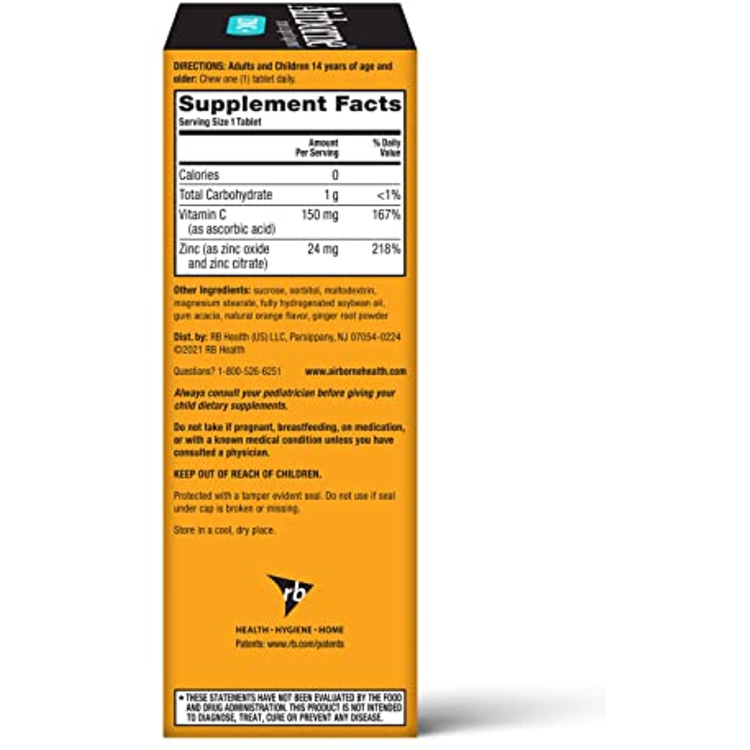 Airborne comes Zinc + Vitamin C Orange Flavor Chewable Tablets are a unique Vitamin & Mineral crafted blend that helps support your immune system.* This once daily Gluten-Free and Non-GMO supplement is an excellent source of ZINC and is high in the antioxidant Vitamin C. WHY TO TAKE ZINC + VITAMIN C: Airborne is the #1 Immune Support Gummy, Effervescent & Chewable Brand.¹ Airborne ZINC + Vitamin C chewable tablets easy & convenient for you or your family to take on the go or at home. Vitamin C is among the most important vitamins and antioxidants in immune health.* DEVELOPED BY A FORMER SCHOOL TEACHER: The original Airborne recipe was cooked up by an ingenious teacher about 20 years ago. Why? Because throughout the school year, she wanted to provide her immune system with proper support. *These Statements have not been evaluated by the Food and Drug Administration. This product is not intended to diagnose, treat, cure or prevent any disease. ¹Based on unit sales L52W through 4/3/2021