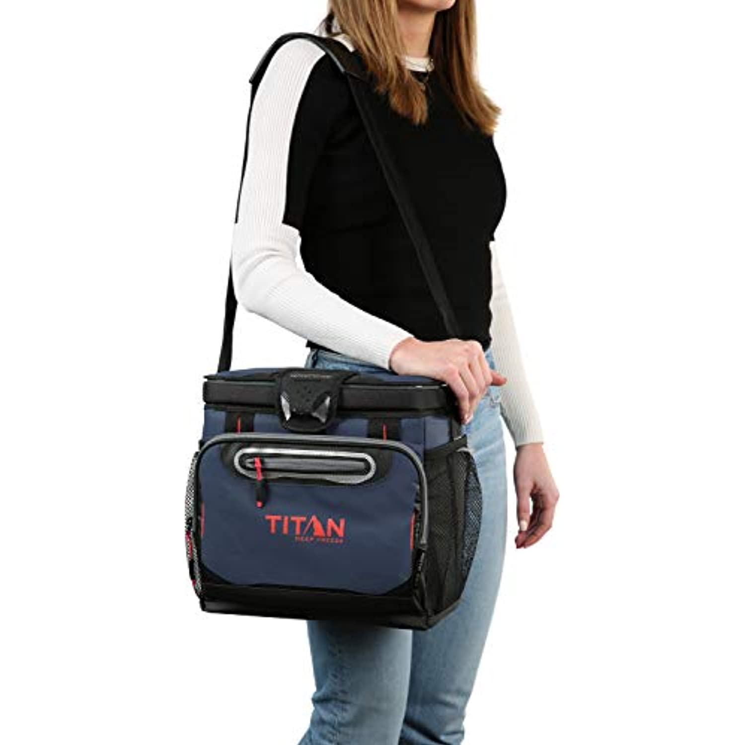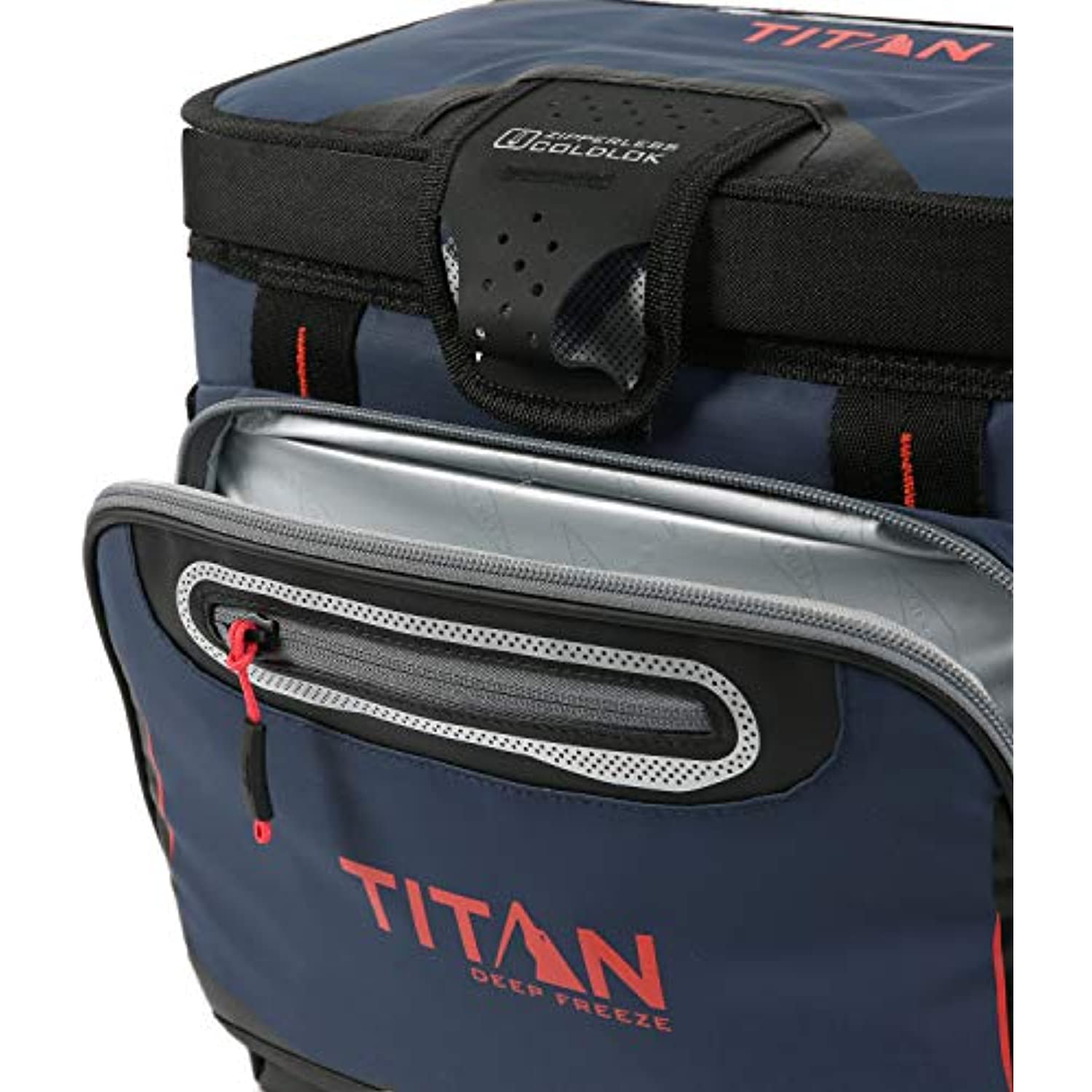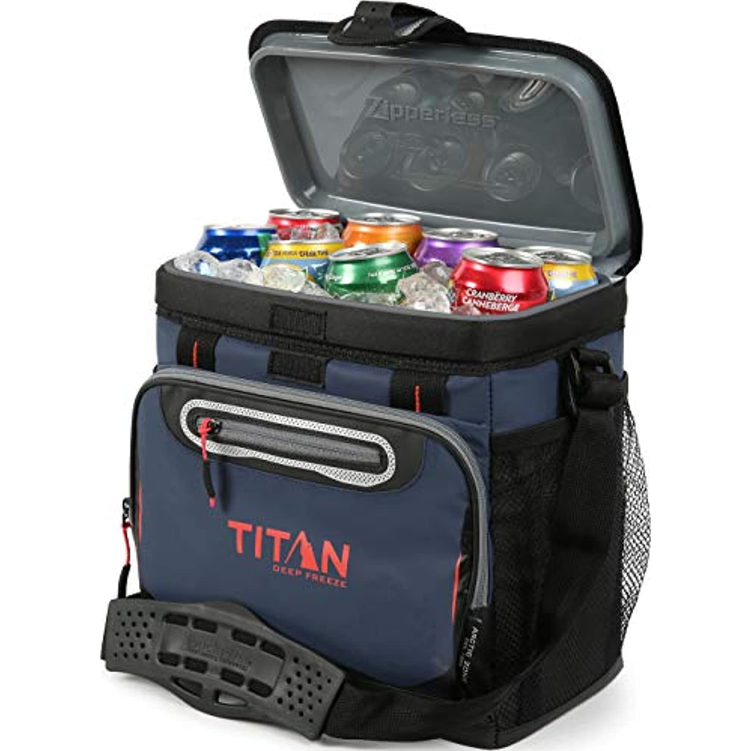 The Titan Deep Freeze Can Zipperless Cooler keeps ice up to 3 days! The exterior includes our patented, “flip-open” Zipperless lid for quick access to food and drinks as well as an insulated front pocket. The interior features Deep Freeze high performance insulation with radiant heat barrier and a removable HardBody liner with SmartShelf. The SmartShelf allows you to keep hard stuff like drinks separate from soft stuff, so sandwiches and other soft foods don’t get crushed. If you want to use the entire liner, the SmartShelf easily removes to provide one large compartment. Designed for convenience and usability, this cooler also features an adjustable Backsaver shoulder strap with shoulder pad and Rhino-Tech exterior material that is tough, water and stain resistant and easy to wipe clean. Interior liner dimensions: (L x W x H) 14.20" x 9" x 10.25"